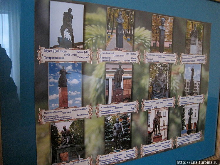 Показалась интересной своеобразная картина, на которой были размещены памятники великим людям Казани, такой своеобразный каталог достопримечательностей.