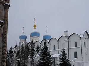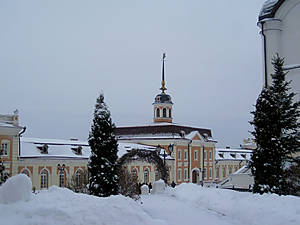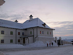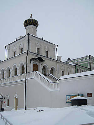 Дворцовая церковь (XVII в.) соединена галереей-переходом с Губернаторским дворцом. Первоначально она называлась Введенской, а после ремонта была освещена во имя Сошествия святого Духа. Храм трехэтажный, одноглавый, белый, украшен изящной резьбой, компактный и очень симпатичный. Интересно высокое крыльцо, ведущее на галерею второго этажа. Очень красива небольшая главка, черная, богато украшенная позолоченными резными дубовыми ветвями. Правда, я так и не поняла, действует ли эта церковь.