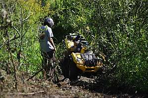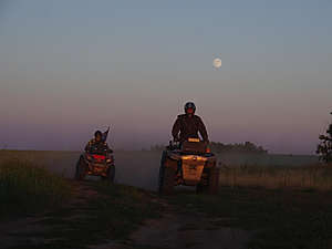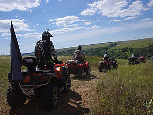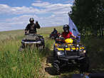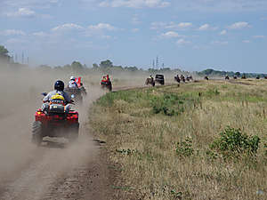 По плану, в первый день было пройдено около 120 километров, до базы отдыха и ночевки. Маршрут проходил в основном по полям с небольшими лесными участками, дикое количество пыли и песка, а так же, лесных насекомых сопровождало квадроциклистов всю дорогу.