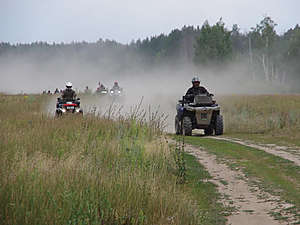 Маршрут почти полностью состоял из лесных песчаных трас и полей. Пыль и песок стояли столбом всю дорогу. Порой ехать приходилось практически наугад, так как, в пылевом облаке невозможно было ничего разглядеть. Встречались жилые и заброшенные деревеньки, селяне с любопытством встречали колонну, стремились рассмотреть поближе, помахать проезжающим или сфотографировать путешественников. А удивленные и слегка недоумевающие коровы и козы, непонимающе смотрели на колонну квадроциклистов.