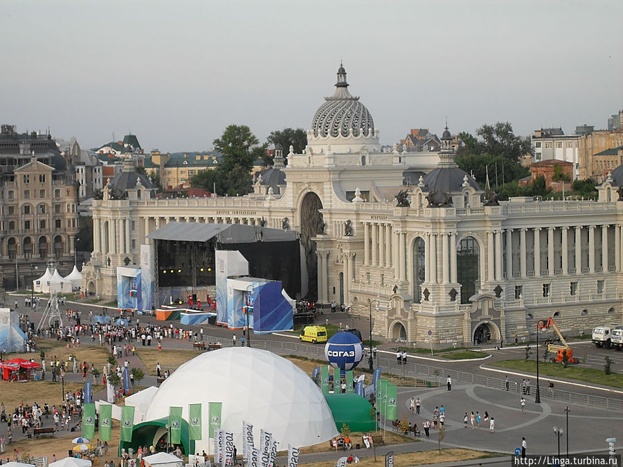 7 июля мы решили вечером прогуляться до Кремля, с его смотровой площадки прекрасно видно представление в Культурном парке Универсиады, организованного у стен Дворца земледельцев. К слову, просто так туда не попадешь: надо иметь использованный билет на какие-либо соревнования (дорогие любители культуры, не думайте, что можно было просто купить за 30 рублей самый дешевый билет на шахматы и оторвать у него «контроль»))). Это своеобразное стимулирование казанцев на активное посещение спортивных мероприятий Универсиады. Хочешь вечером посмотреть выступление артистов «Cirque du Solei», утром бегом на легкую атлетику.