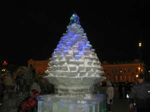 У кукольного театра был разбит детский ледовый городок. Прошли через ледяные ворота, полюбовались на скульптуры подсвеченных елок, горки, зеленое дерево в гирляндах. В парке было полно малышей. Это и понятно, всего-то 7 вечера, как раз «детский новый год». Ну, а мы, выскользнув из «страны чудес», под колоннадой кукольного театра выпили по глотку шампанского, так смачно, прямо из горла (обожаю так пить этот пафосный напиток :)) и пошли ближе к гостинице.
