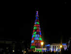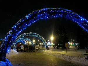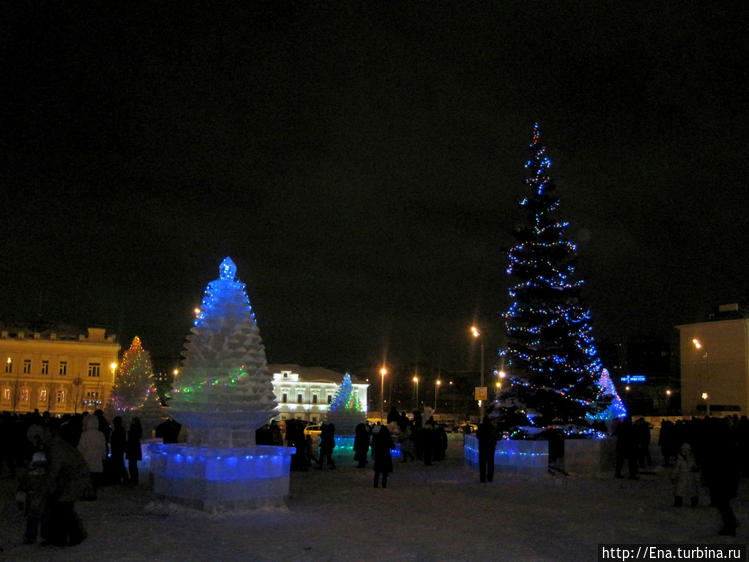 Ну ладно, не больно и хотелось. Дерево таки «загорелось». Забравшись на сугроб, увидели более чем странную «Главную елочку». Хм, чудная она была, цветная, конечно, да, словно радуга, но такая вся искусственная, будто склеенная из блестящих лоскуточков. Мне-то представлялось такое зеленое пушистое дерево, северное, с длинными иголками. Ан нет, получайте хайтековскую елочку, и все тут. Вроде бы торжество должны были продолжить местный Дед Мороз – Кыш Бабай, Снежный барс и кто-то там еще, но видно все равно ничего не было, мы прошлись по аллеям и вышли из парка. Читала, что летом здесь играет красивый фонтан, разбиты клумбы, наверное, приятное, местечко.