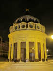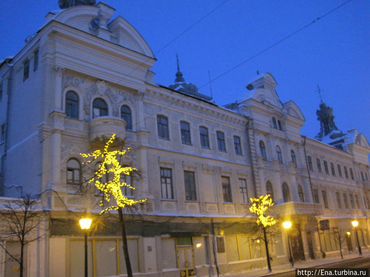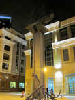 И вот мы его увидели. Кукольный театр «Сказка»! Прямо сошедший со страниц сказки про Буратино, да не тот, Карабасов, а именно найденный за холстом с нарисованным на нем камином в каморке папы Карло. Тот, в который вела дверь, открытая Золотым ключиком. Признаюсь, театр меня впечатлил еще днем. Но ночью он был просто обворожителен. Новое здание, современное. Похожее на сказочный замок. Плюсуйте к этому удачную подсветку, ночь, иллюминацию, праздничное настроение! Да я сама вдруг, забыв обо всех своих печалях и горестях, ощутила себя принцессой, стоящей у ворот этого прекрасного дворца! Я не могла отвести от него ни взгляда, ни объектива фотоаппарата. Ну вот, смотрите, и ваша вечная Царевна-Несмеяна (это я про себя) заулыбалась :). Точеные башенки по бокам, ажурная колоннада, праздничный трезубец наверху, круглые часы над входом, органичное сочетание белого с золотым – все это рождало волшебную сказку.