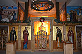 Совершенно необычными оказались в этом храме иконы. Их необычность заключалась не только в том, что они располагались в ряд, на правой и левой стенах. Необычность заключалась и в выборе персонажей. Для полной идентификации можно взять у входа брошюрку с подробным описанием всех икон. Здесь, кроме традиционных апостолов и святых, можно совершенно неожиданно встретить не менее знакомые лица, но которые практически никогда не встретятся в православных храмах. Это, например Папа Иоанн Павел II, или даже Александр Мень! Об Александре Мене здесь написано, что это одна из самых выразительных личностей, связанных с воскрешением христианства в современной России. Есть здесь и мать Тереза из Калькутты. И совершенно неожиданно ещё одна фигура из российской истории — Святая Елизавета, правнучка английской королевы Виктории и сестра последней российской императрицы Александры, варварски убитая большевиками в 1918 году.