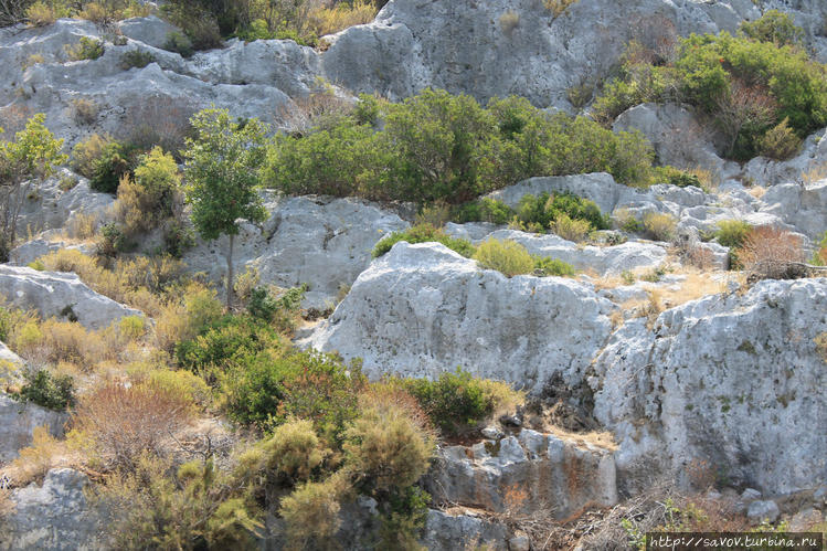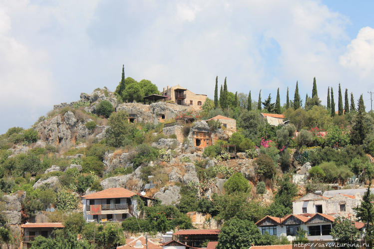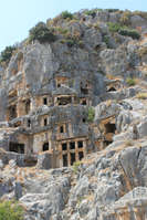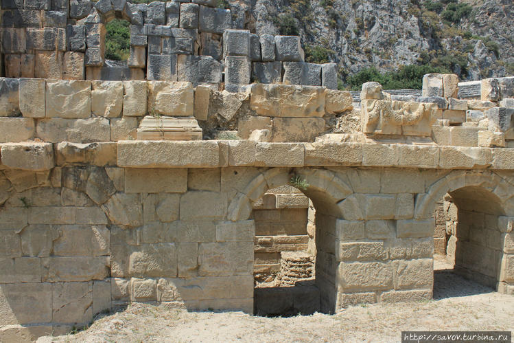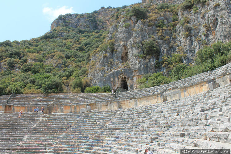 Над театром расположены могильники. Так хоронили ликийцев. Три окна — три двери или два окна-две двери. Внутри располагали возвышение на которое клали мертвеца, свернутого в позу эмбриона. Как пришел, так и уходишь. Ликийцы считали, то предкам хорошо посмотреть театр, поэтому могилы соседствуют с театром.