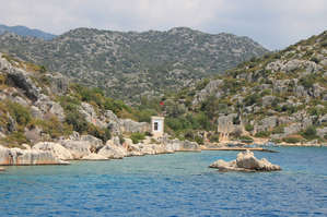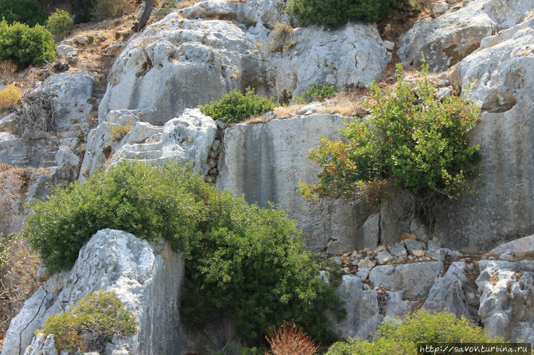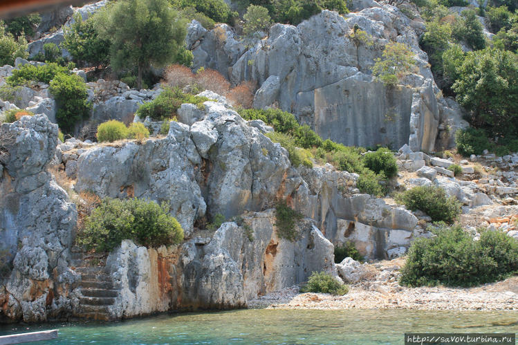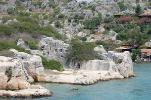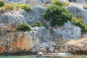 Город был военной базой, здесь жили только солдаты "таможенники" — собиравшие дань с проходящих судов. На фото видны остатки стен, ступени, спускающиеся в воду. Здания вырубали в скале, а фасад достраивали камнем. Город погиб при землетрясении.