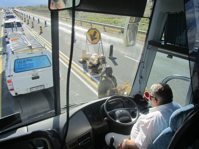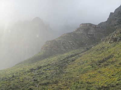 Вынырнув из тоннеля, мы как будто попали в другой климатический район, солнце, сиявшее в Ворчестере, спряталось, горы стали темными и спрятались в тумане. Мы огорчены, так как становилось под вопросом посещение знаменитой Столовой горы в Кейптауне. Сибони сказал: «Let’s get our fingers cross», чтобы тучки разошлись, дождик прекратился, и мы были счастливы!