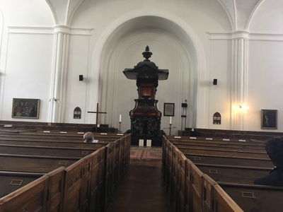 Внутри церковь практически вся выполнена из древесины – деревянный орган, деревянные скамьи, деревянные галереи и чрезвычайно богато украшенная кафедра со скульптурой двух львов, под которой похоронен Симон ван дер Стель – первый губернатор Голландской Капской колонии и основатель старейших винодельческих поместий Groot Constantia и Stellenbosch.