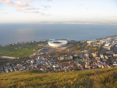 Сверху виден порт, футбольный стадион, построенный к Чемпионату мира по футболу 2010 года, и набережная Victoria & Alfred Waterfront.