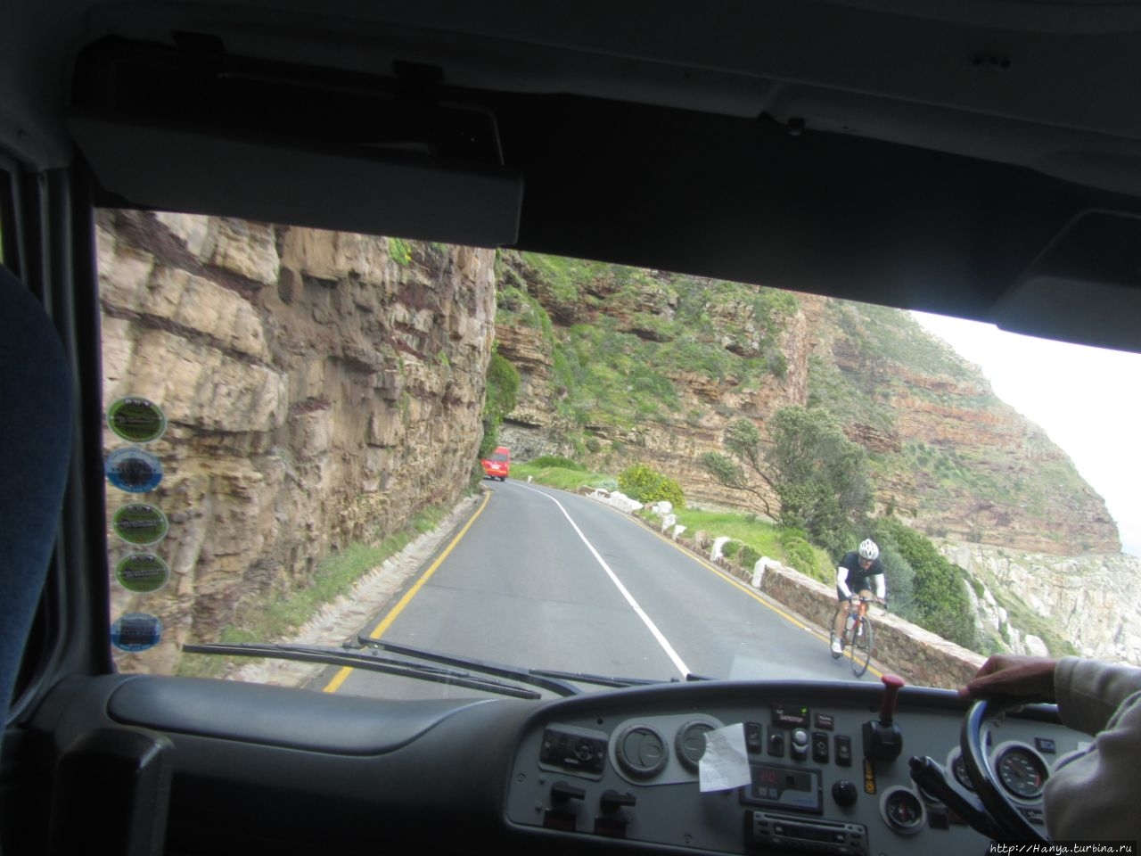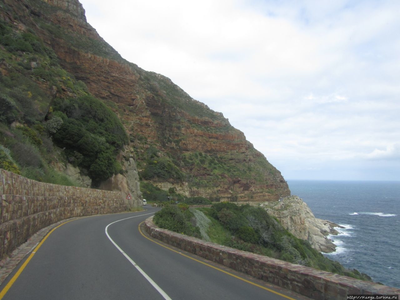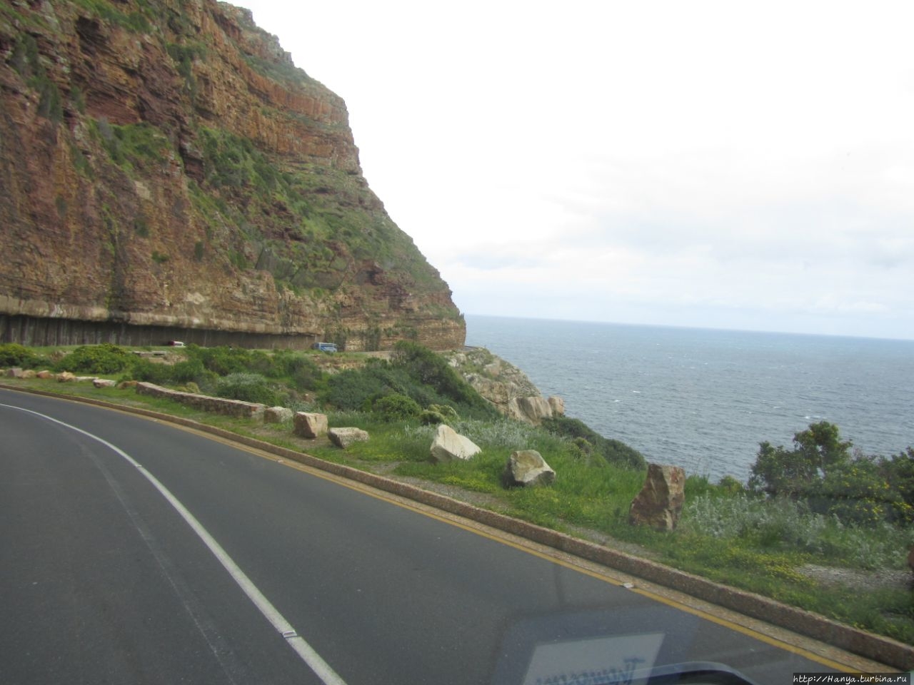 Капский полуостров:Seal Island Cruise к морским котикам. Ч79) поднимаемся вверх в гору и далее по горной панорамной, петляющей трассе, едем вдоль океана, по краю скалы. Это Чэпменс Пик Драйв (Chapman’s Peak Drive), на одном из поворотов водитель притормаживает, а гид дает возможность полюбоваться красотами местности и видом океана. .