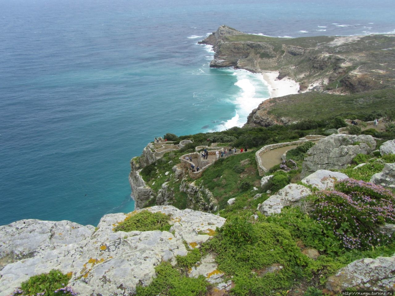 Однако, то, что именно в этом поинте встречаются воды двух океанов, тоже некорректно. Место, где встречаются два океана, намного дальше, географически это происходит на 150 км восточнее, у Мыса Игольный. Думаю, туристам-дилетантам это все равно, и все довольствуются этим сайтом, а может быть, это туристические фирмы возят только сюда? Спускаемся вниз, и идем очень осторожно, ветер в буквальном смысле сбивает с ног, пытаясь приподнять нас как Элли из Страны Оз.