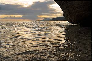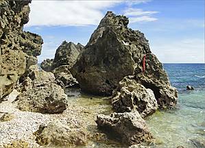 Пока наши девы синхронно плавали, я решила обследовать берег. С одной стороны он заканчивался небольшим мысом, где виднелись каменные образования, заметно оживлявшие спокойное море.