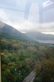 Сойдя с кораблика мы прошли к станции фуникулера, чтобы наверху воссоединиться с Ксенией и, в первую очередь, ощутить на себе "прелести" Овакудани. . Станция канатки оказалась неожиданно большим и просторным помещением, неплотная очередь двигалась быстро. Вскоре кабинка уже поднимала нашу компашку сквозь тучки на высоту 1044 метра. По мере набора высоты тучки как-то испарялись, причем не потому, что оставались ниже, а рассеивались, открывая небо, горизонт и вид на озеро Аси.