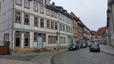 Теперь я покажу вам то, что нам удалось посмостреть самим, а именно, фахверковый старый город, или то, что от него осталось. После бомбежек 45-года центр Хальберштадта был сильно разрушен, в послевоенные годы денег на восстановление не хватало, развалины фахверковых кварталов были расчищены. На их месте остались или пустыри (читай — парковки) или с течением времени, жилые многоэтажки. Но кое что сохранилось. Сначала мы прошли по улице Voigtei и свернули на Backenstrasse.