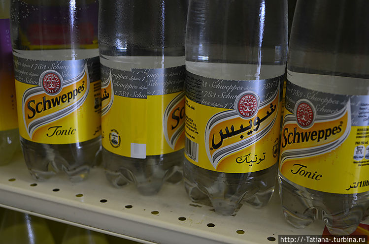 В Тунисе есть государственная сеть условно «супермаркетов» с удобным названием «дженерал». Вполне нормальный магазин. Внутри… наверно как наша бюджетная сеть «фамилия» со всякой недорогой мелочевкой только еще с продуктами. Фотографировать там почему-то оказалось нельзя. Зато смотрите, как красиво написано «швепс». Русское написание этого слова самое примитивное что ли. Родной тоже вполне витиеват, но арабской вязью – самый красивый вариант.