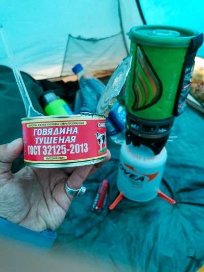 Ужинал аскетично, но калорийно. Спасибо Диме Белорусу за подгон из Белоруссии! Тушёная гостовская говядина отличного качества! Очень рад, что её норвежские таможенники не отобрали когда я переходил границу в районе Мурманска.