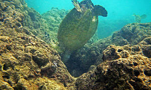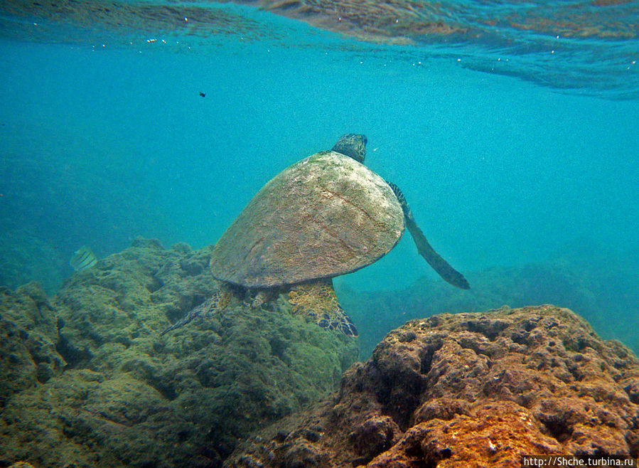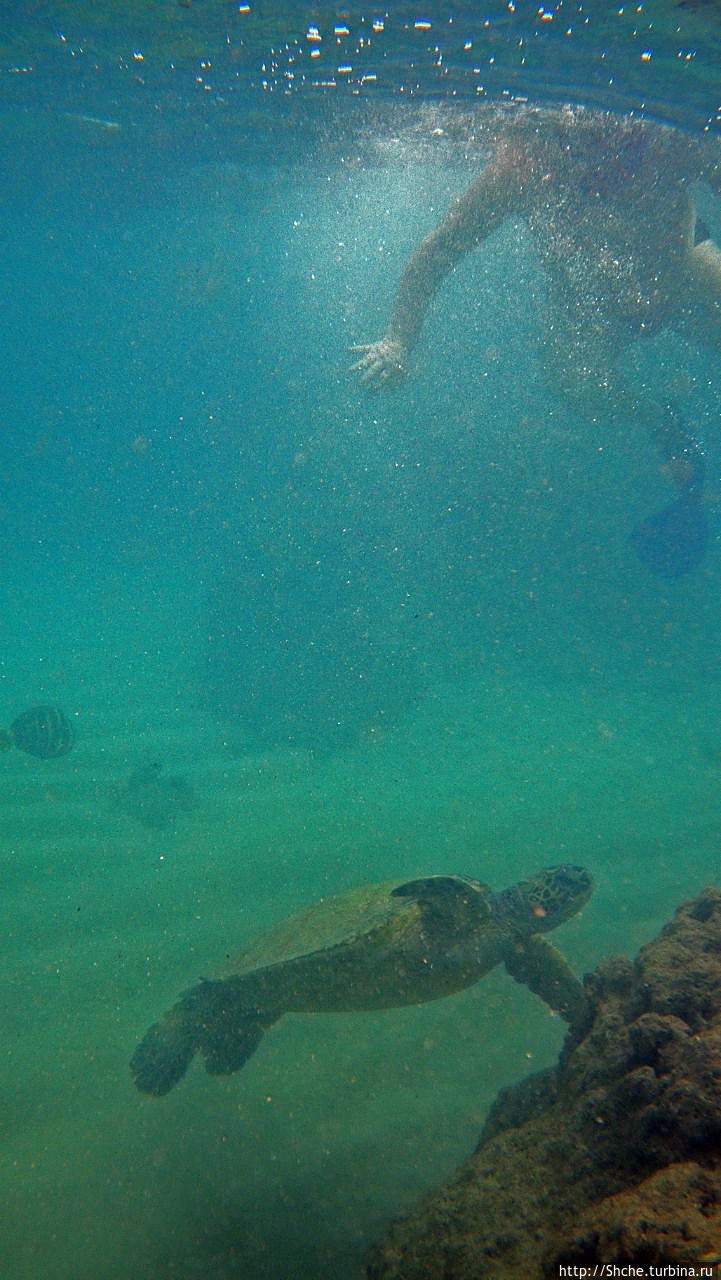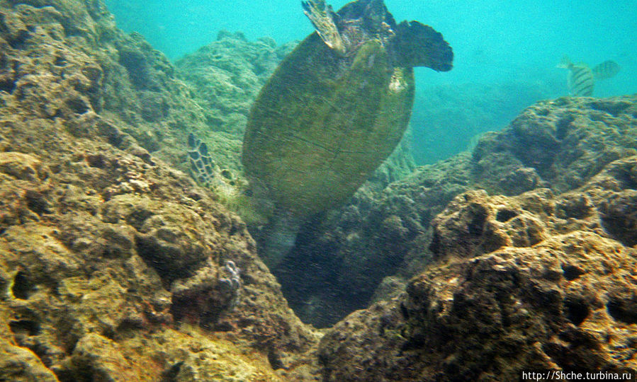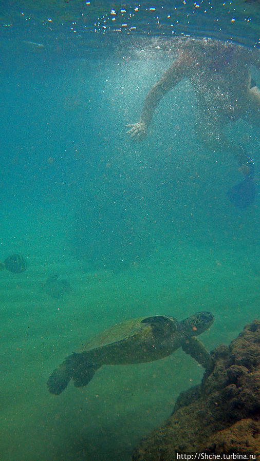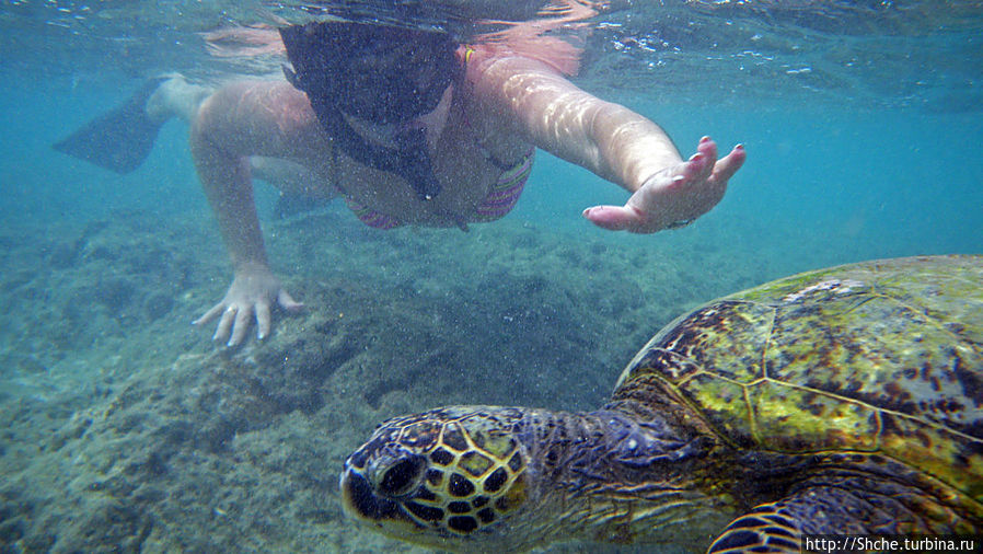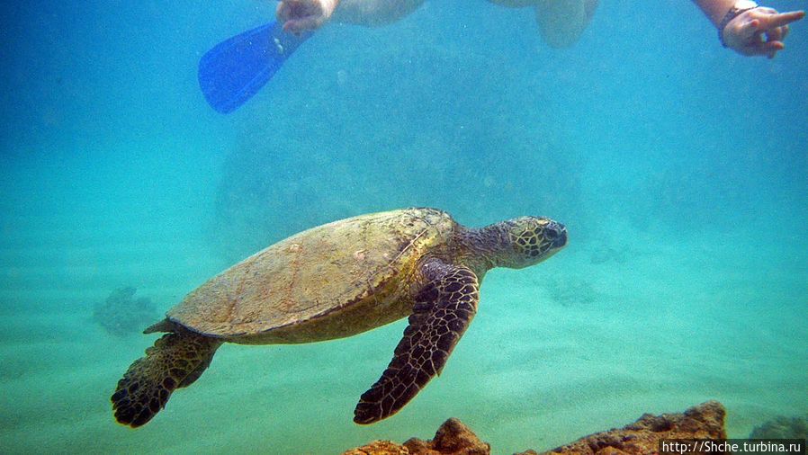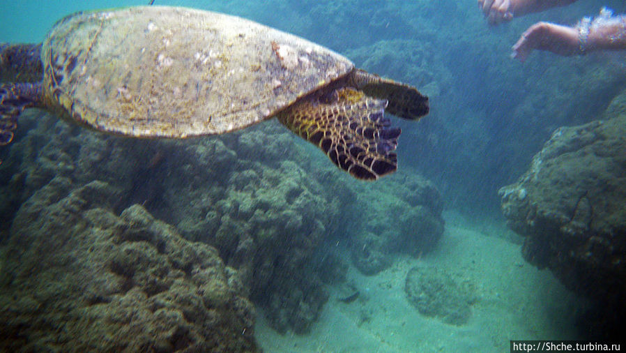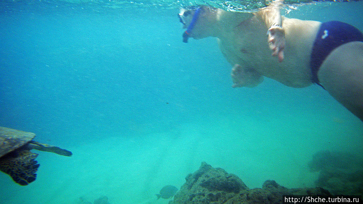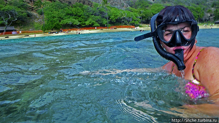 Ханаума-Бей — лучшее место для снурклинга на осторве Оаху, а, как по мне, так и вообще на Гавайских островах. Хотя американцы на картах отмечают десятки "лучших в мире мест для снурклинга, где можно покупаться с черепахами", на то они и американцы, мне выпала такая возможность лишь раз. И по иронии судьбы, в первое же купание, на первом же пляже, да еще и в первые десять минут. Было чувство, ну вот, уж за две недели то... у-ух! Ан нет, скажу сразу, больше с черепахами я не плавал. Видел на берегу и в воде, но не плавал...
