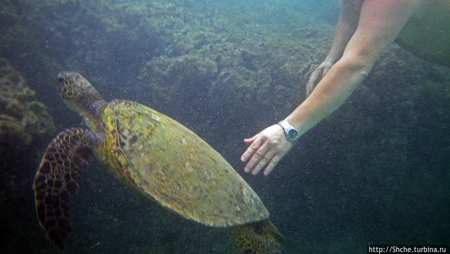 А дело было так. Я с супругой едва подогнал и одел арендованные маску с трубкой и ласты, как Виктор, мой товарищ, быстро потащил нас к обнаруженной им черепахе (он забыл на берегу свой подводный фотик). И на окраине рифа мы действительно увидали ее