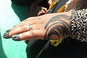 Потом женщина – специалист рисует узоры хной на руках и ногах. На руках изображаются браслеты, сложные затейливые рисунки. Орнамент на ногах идет от пальцев ног до колен. Даже на ступнях и на животе выполняется красивый оригинальный рисунок. На свадьбе невеста надевает босоножки с тонкими переплетами, чтобы все видели рисунок хной.