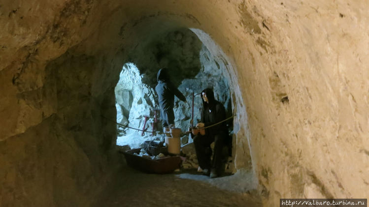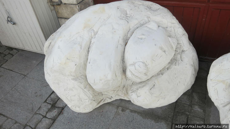 Но основная приманка для туристов это 15-километровые меловые выработки, где в свое время добывали мел и известняк для строительных целей, а во время войны в них скрывались от нацистов евреи. Конечно, туристический маршрут гораздо короче — около 1800 метров, проходит под центральной частью города, местами отмечены названия улиц, находящихся наверху, экскурсия рассчитана где-то на час. Вход находится на Любельской улице, дом 55А. Экскурсии (на польском языке) проводятся в 11, 13 и 16 часов. Билет для взрослого 12 злотых. Ну и конечно, подземелье не обойдется без доброго духа, хранителя шахты – белого медведя Белюха (хотя приведение, неожиданно появляющееся перед туристами, на медведя почему-то не похоже). Белюх является символом города и изображен на гербе Хелма. Герб довольно своеобразен – белый медведь на зеленом фоне пробирается среди зеленых же деревьев, похожих на пальмы. То есть Белюх, наверно, не арктический медведь, а просто альбинос. На фото — Белюх, высеченный из мела, добытого в шахте.