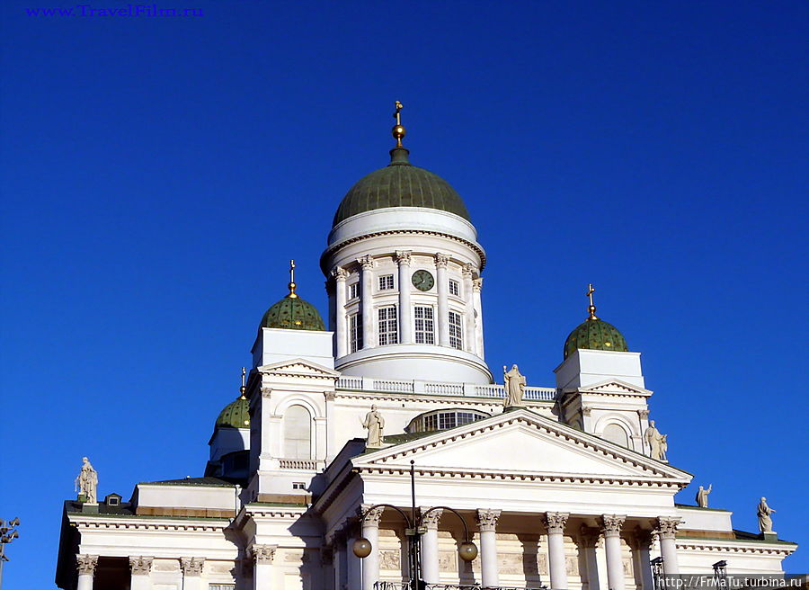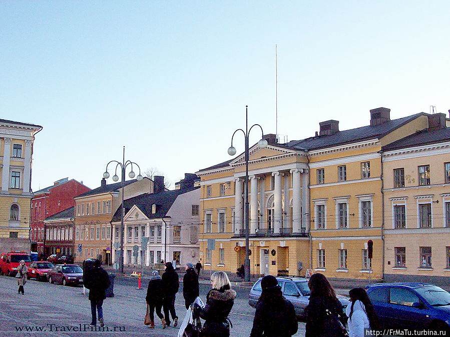 Кафедральный собор на Сенатской площади (1830-52 г.), Государственный совет и Университет, а в центре площади — памятник российскому императору Александру II.