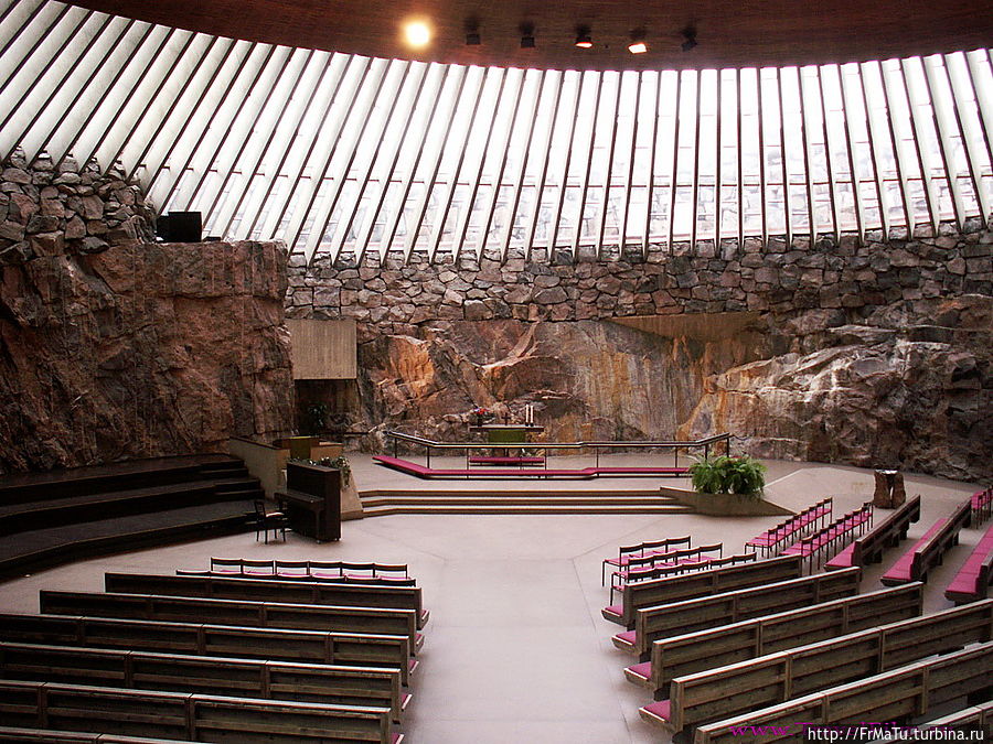 Нужно обязательно зайти вовнутрь! Обратите внимание на потолок, он создан из нескольких десятков километров медной проволоки, а сам храм напоминает скорее концертный зал, но это и не удивительно, потому что, здесь каждую неделю проводятся концерты огранной музыки.