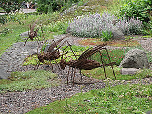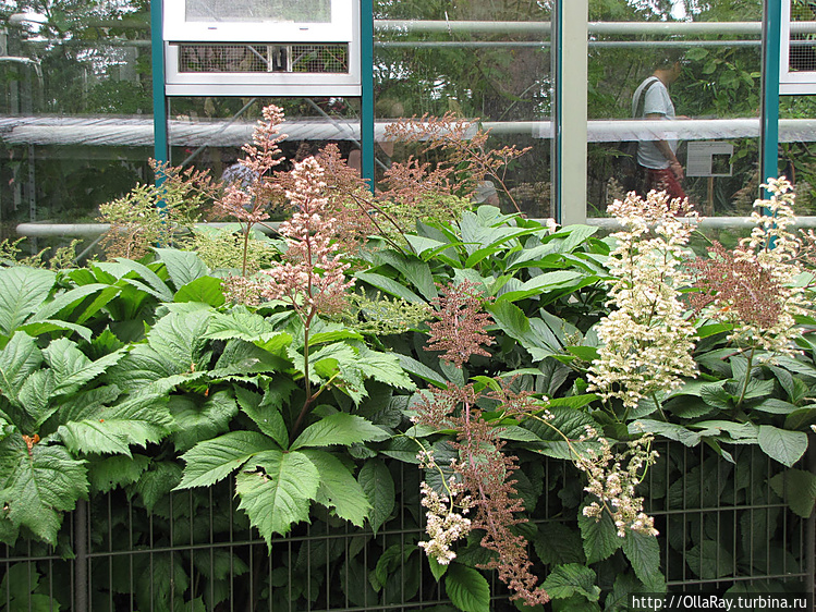 Внутри павильонов устроены оранжереи и водопады. А снаружи — заросли роджерсии и плетёная садовая скульптура.