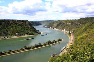 Рейн течет среди лесов и горных хребтов Зибенгебирге (нем."семигорье"), через районы Вестервальд , Хунсрюк и Таунус , а по его крутым берегам раскинулись виноградники и рыцарские замки. Река не раз вдохновляла создателей великих произведений: это и архитектурные памятники эпохи императора Вильгельма, и величественная музыка Рихарда Вагнера.
