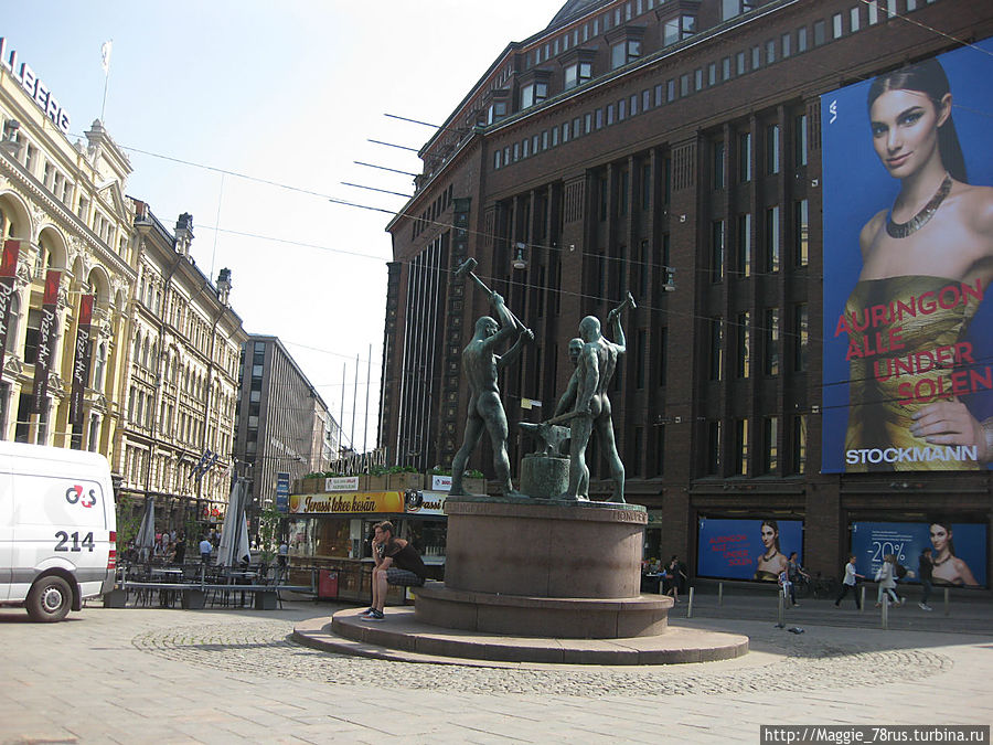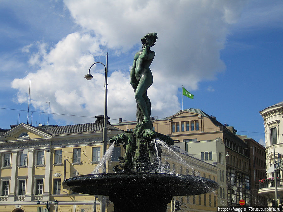 Здесь находится еще одна достопримечательность, фонтан Havis Amanda (Морская нимфа). Морская нимфа считается символом столицы Финляндии. Правда символ предстает перед нами в весьма пикантном виде: бронзовая нимфа абсолютно обнажена-"распутницу" изваял в 1908 скульптор Вилли Вальгрен. Возможно, к ней на свидание спешил "наш лыжник". Когда мы подошли, здесь уже яблоку упасть было негде. Поэтому фото позаимствовала у Генри Сивонена ( Henri Sivonen).