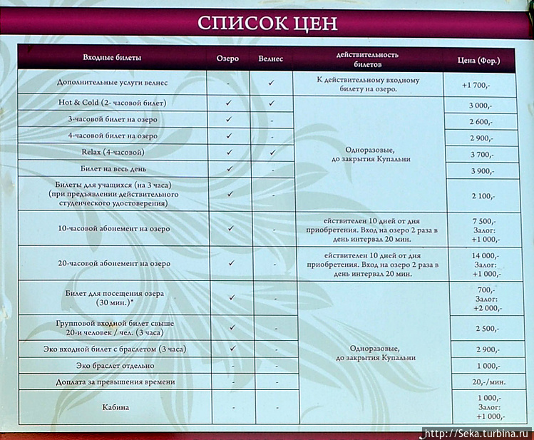 Шаг следующий – покупка билета(ов) для входа на озеро. Касс тут несколько и есть прейскурант на русском языке. Так что разобраться не составит никакого труда. Есть просто билеты, а есть абонементы. Второй вариант подходит для тех, кто приехал отдыхать на озеро надолго. Я брала абонемент на 20 часов, при этом выдается браслетик, на котором эти 20 часов «записаны» и его вы оставляете у себя пока не выходите всё время. За браслет берут залог 1000 форинтов, который при возврате браслета в кассу, вам вернут.