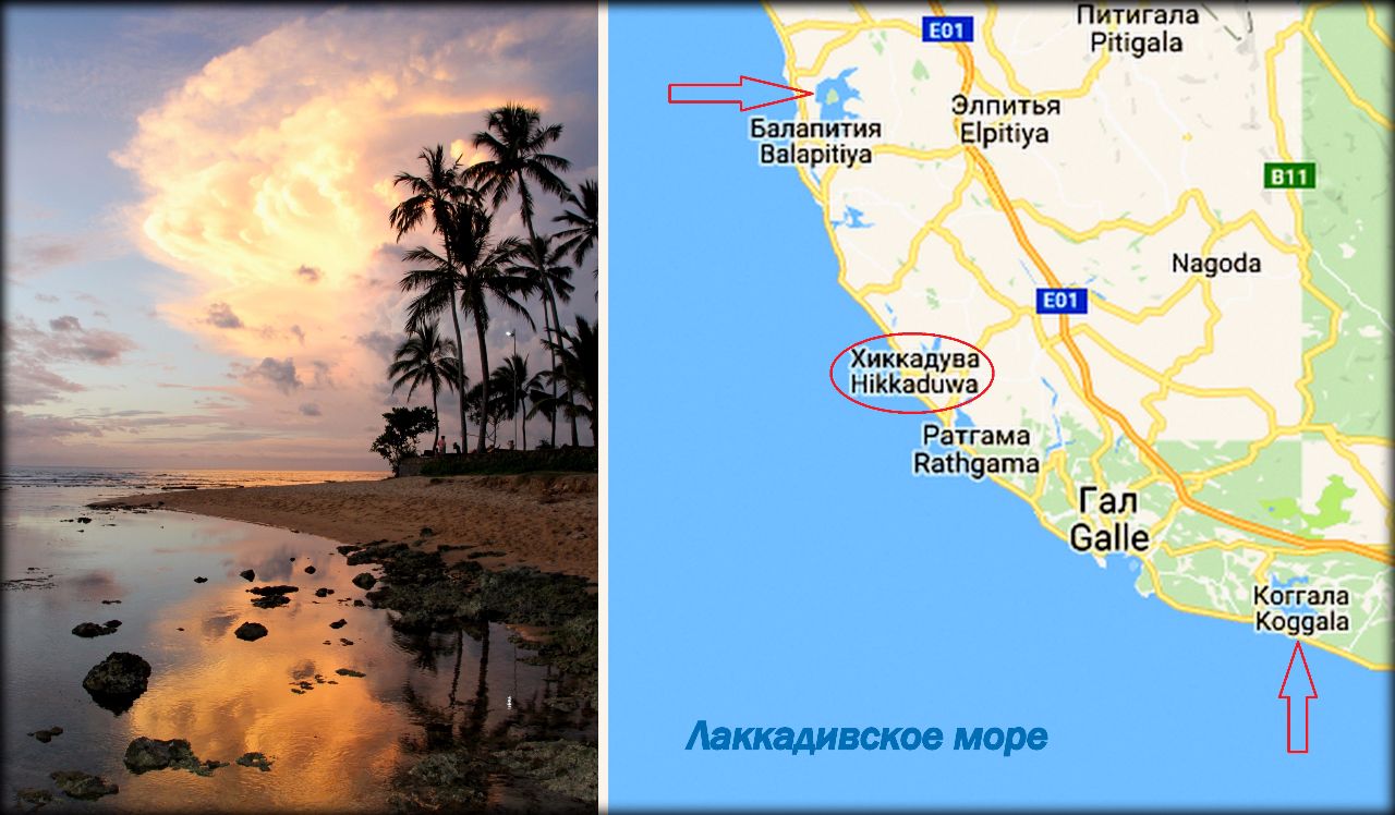 Наш отель Hikka Tranz by Cinnamon 4* находился в известном туристическом посёлке Хиккадува. На карте стрелками отмечены крайние точки в которые удалось доехать во время индивидуальных экскурсий.