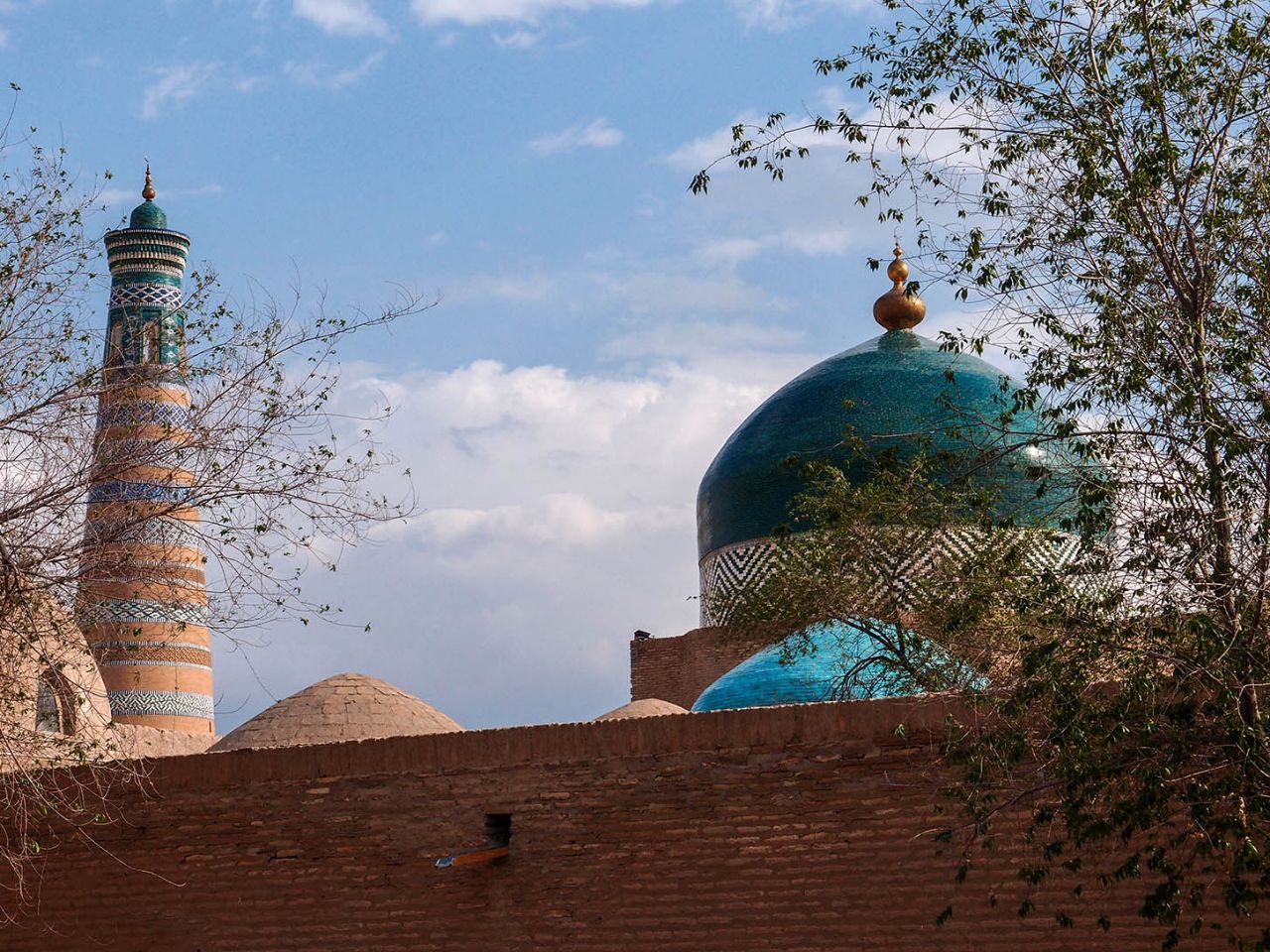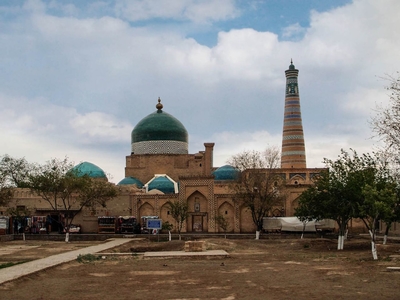 Зелёный купол выглядел привлекательно с самых разных ракурсов, неизменно дополняя и украшая собой фотографии, которые я в Хиве делала, кажется, бесконечно. А вот вовнутрь этого красивейшего здания получилось попасть лишь на третий день, на закуску. Или на десерт. Это был, однозначно, великолепный десерт.