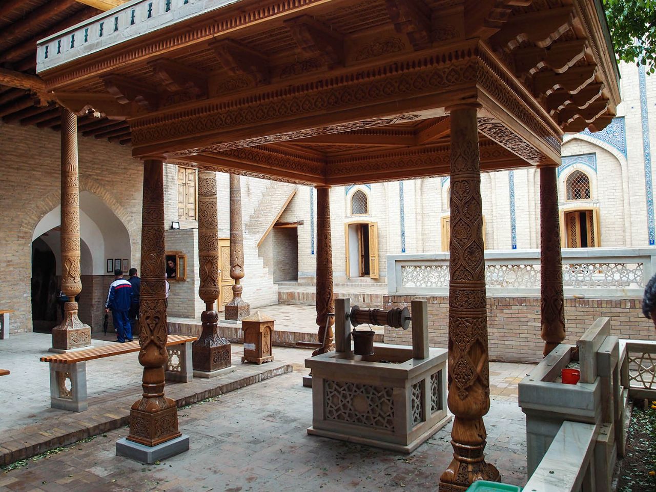 Комплекс оказался не мечетью, хотя все атрибуты оной внутри имеются, как и изрядное число молящихся. Но прежде всего — это мавзолей очень почитаемого в Хиве человека — Пахлавана Махмуда.