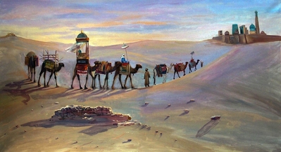 Настроения добавляли и яркие картины, украшавшие стены. Сюжеты в тематике Шёлкового пути, который проходил через Хиву.