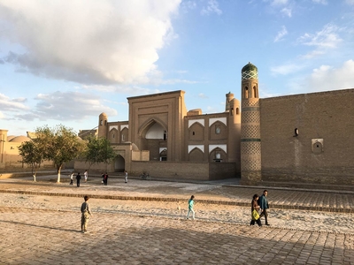 В общем, запоминая каждый свой шаг и назначая ориентиры, я прошла всего пару улиц, поворот, ещё поворот... и неожиданно вышла в самое сердце Ичан-Калы — на площадь, которая обрамлена самыми известными туристическими достопримечательностями: с одного края — знаменитейшее медресе Мухаммад Рахим-хана, с другого крепость Куня-Арк.