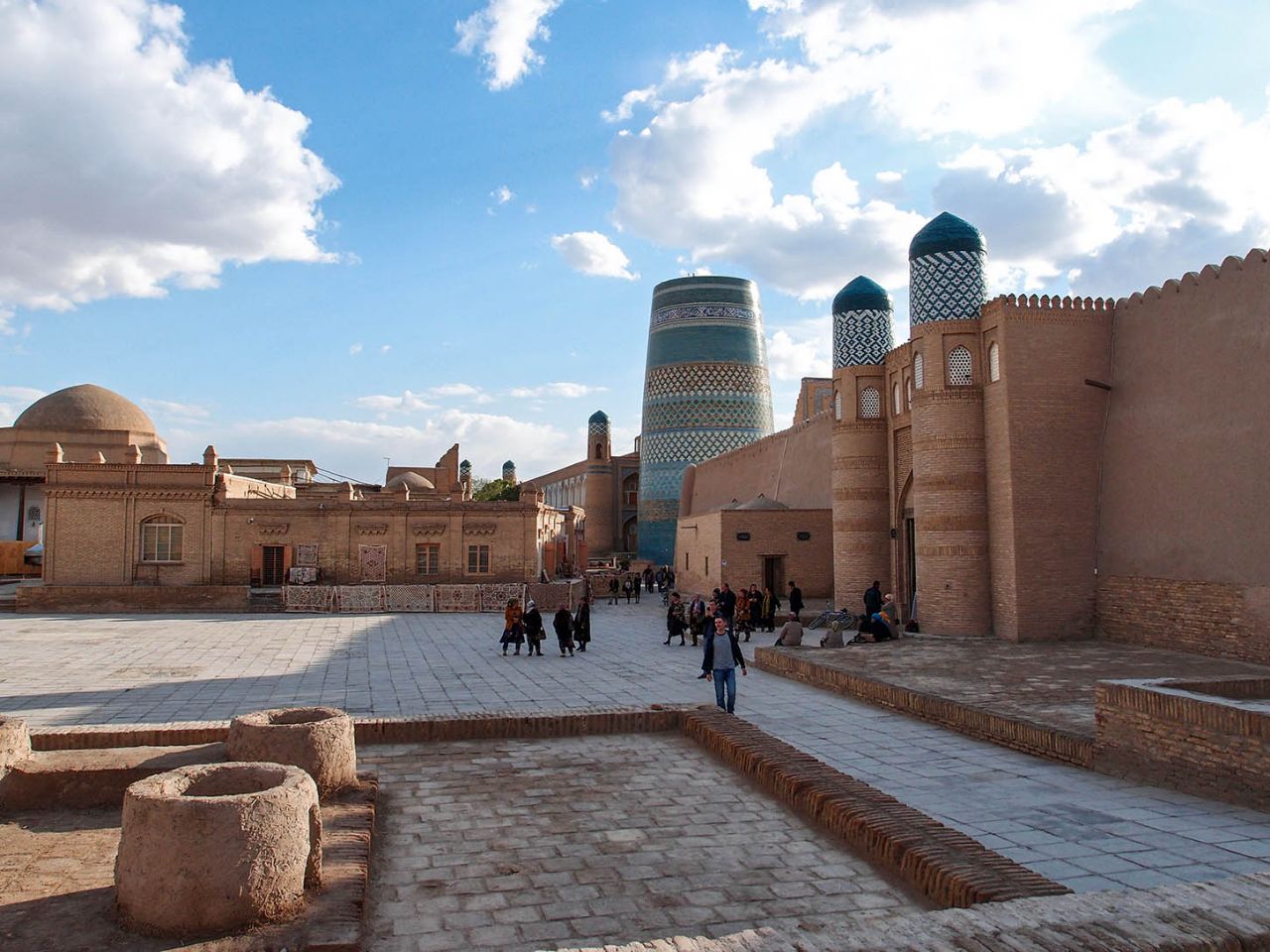Великолепный ансамбль подчеркивала массивная башня недостроенного минарета Кальта-Минор. Роскошная, одетая в узоры из плитки, словно залитая глазурью! Несмотря на то, что башня возвышается лишь на треть своей проектной высоты, она превосходит все строения Хивы, и сегодня это, безусловно, один из самых запоминающихся символов города.