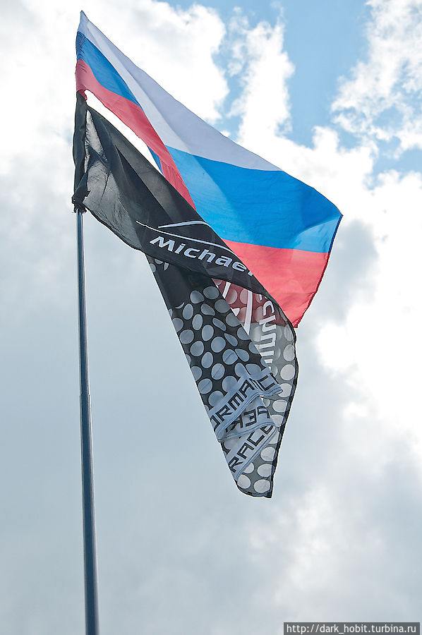 Пока пилоты боролись на трассе, наша делегация была занята установкой флага. Древком послужил спининг, который, в дальнейшем не оправдал возложенную на него ответственность. Внизу гордо реет флаг Михаэля Шумахера. И хотя многие из нас не болеют за этого пилота, возражать никто не стал.
