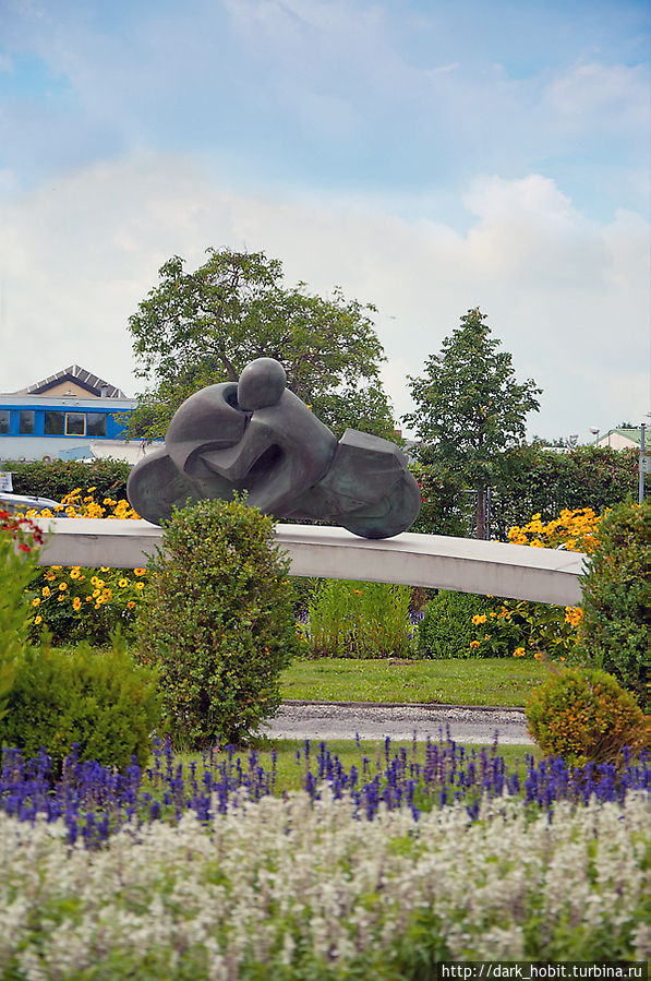 На въезде на Хоккенхаймринг стоит скульптурная композиция со спортбайкером. Очень приятно. В этой стране вообще уважают мотоциклистов, выделяя им отдельные парковки. Кстати, мотоциклисты в Германии, как мне показалось, люди в основном за 40, ездящие либо на BMW GS, либо на трайках всех немыслимых форм и размеров, остальных видов как-то меньше. Но об этом как-нибудь в другой раз.