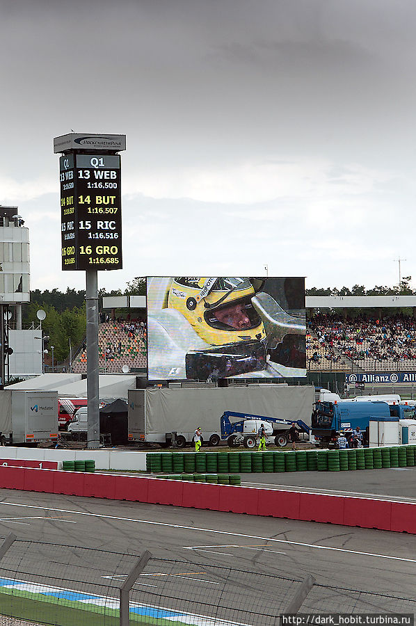 А дальше началась квалификация Формулы-1. В принципе, находясь на трассе не испытываешь информационной изоляции, несмотря на немецкий комментарий, который, конечно, никто не понимал. Удачно расположенный экран, где все видно и табло, оперативно сообщающее результаты — держали в курсе событий. А еще кто-то из наших ребят установил приложение на мобильник, отслеживающее в реальном времени пермещение всех болидов. Очень удобно было.