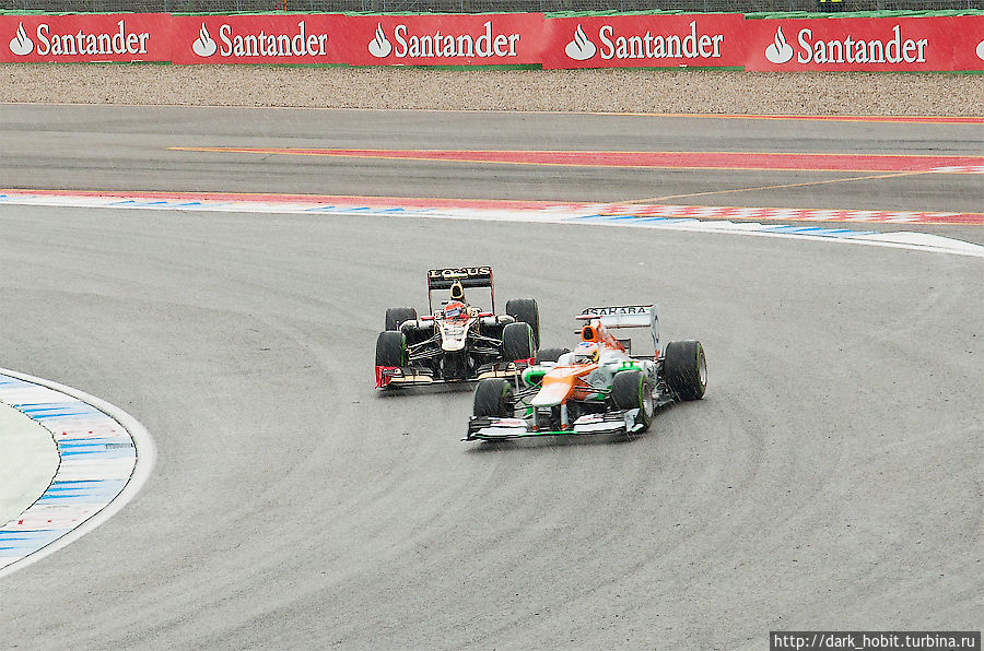 А потом налетели облака и пошел дождь. Вообще, я считаю нам повезло посмотреть на болиды во всех возможных условиях: дождевая квалификация и сухая гонка. Большая удача. На кадре ниже Lotus встретился с Force India, что для квалификационных заездов не очень хорошо, так как трафик негативно сказывается на результате. Оба болида с зелеными ободками — промежуточная дождевая резина.