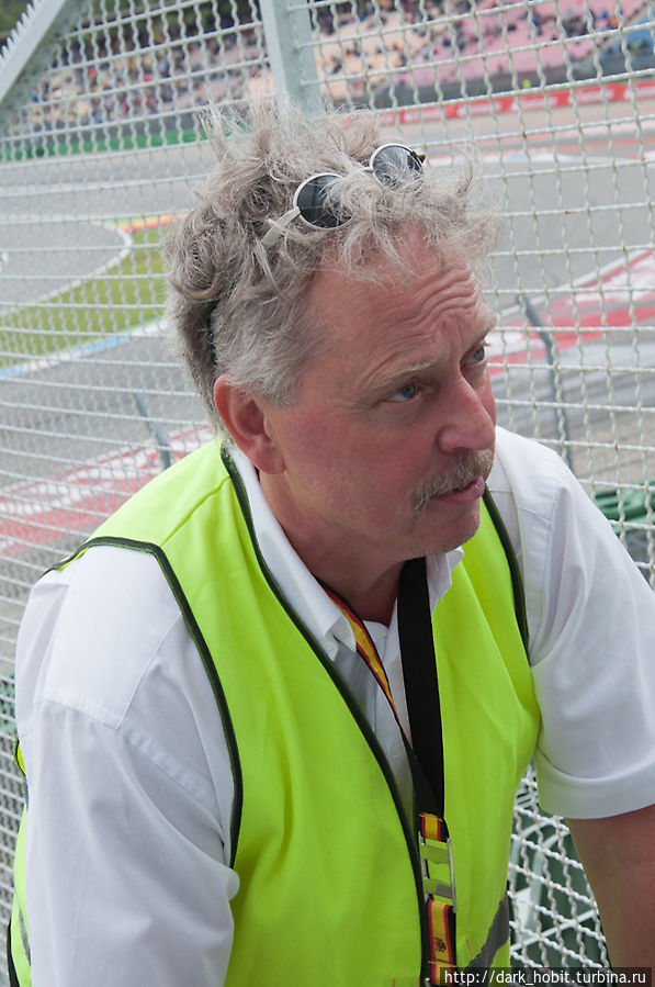Погуляв по парку, мы пошли на трибуны. В нижней части фото видны ворота, через которые, показав билет, проходишь к своему месту. Никаких очередей, никаких рамок металлоискателей, никаких обысков. И что характерно, при таком ненавясчивом уровне безопасности, за викенд не было замечено особых происшествий. Это я сравниваю с организацией того же Moscow Racing на Васильевском спуске, когда многотысячную толпу сначала заставили ждать час, а потом всех пропускали через три рамки. Организаторам не помешало бы перенять опыт иностранных коллег.