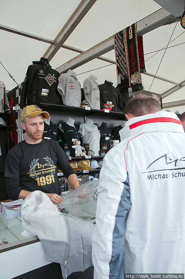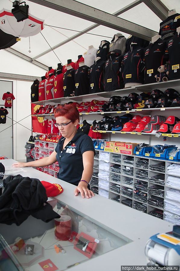 Магазинчики представляют ассортимент как какой-то отдельной команды, так и всех основных команд разом. Нашей главной целью было купить беруши, так как рев от двадцати болидов весьма давит на уши.