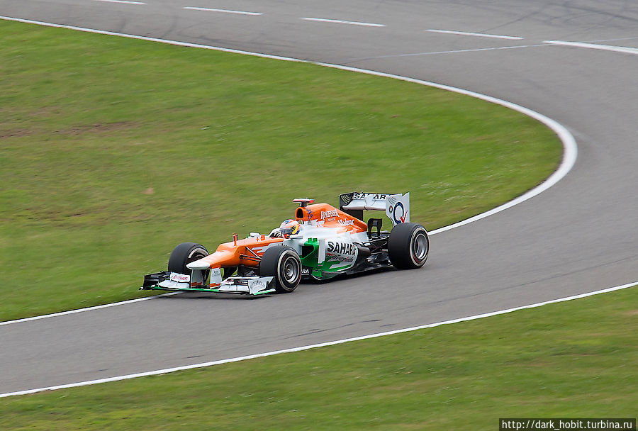 Как видно, асфальт совсем сухой, все едут на среднем типе резины. Болид Force India.