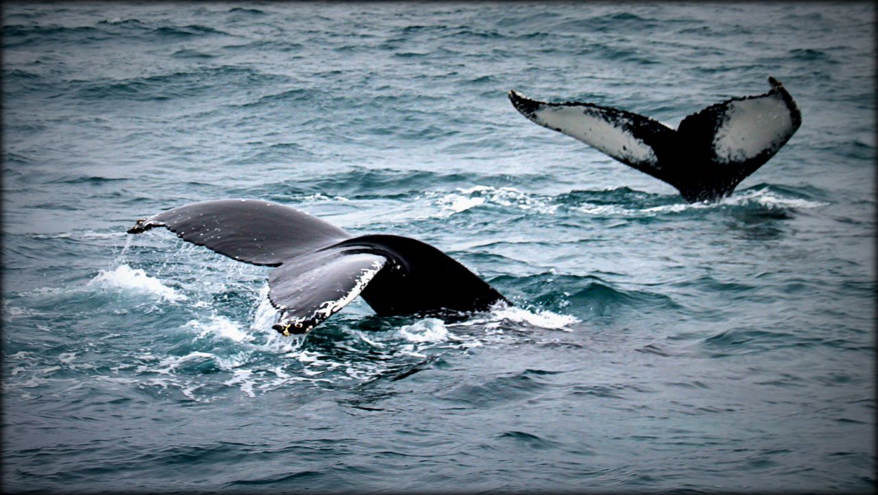 С ныряющими хвостами они в синхроне уже немного сбились. Но, всё равно было красиво смотреть на ныряющих королей океана.