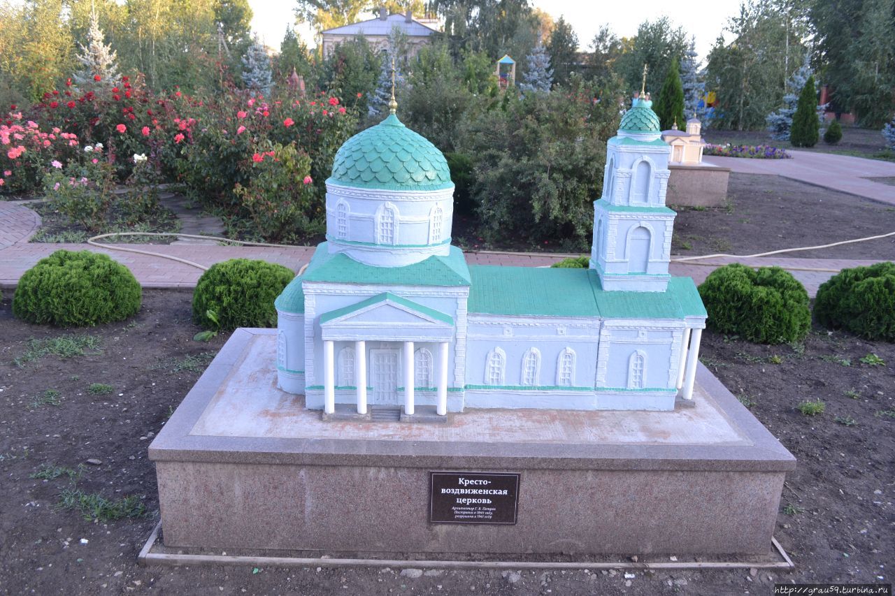 Расположен "Сад храмов" во дворе Крестовоздвиженского храма города Хвалынска .