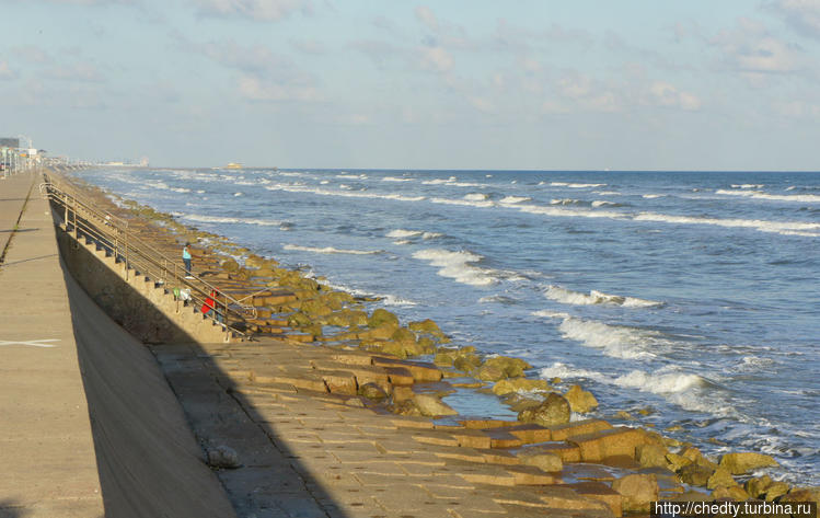 Еще в Галвестоне можно искупаться. В самом городе берег закрыт пятиметровой бетонной стеной специальной конструкции. С помощью этой жалкой стены люди пытались бороться с океаном. Ее строили очень долго, но как раз когда завершили налетела Большая Волна и в очередной раз снесла весь город. За пределами города идут бесконечные пляжи. Кое где есть души, маленькие кафешки и раздевалки, а так в основном просто пустой берег. Если машину не очень жалко, можно ехать не по дороге, а прямо по песку и остановиться там где понравится, все равно вокруг никого, да и выглядит все приблизительно одинаково. Остров Галвестон соединен с другими островами мостами и паромом.