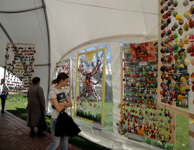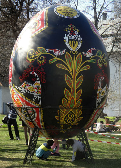 Наибольшее количество поклонников расписанных яиц уже собирают возле себя двухметровые писанки. Они выполнены в авторской манере и каждая имеет свой неповторимый стиль. Свою гигантскую работу представила каждая область страны. Большие писанки можно потрогать, покрутить и попробовать обхватить их руками ) В отдельной беседке – писанки киевских школьников.
