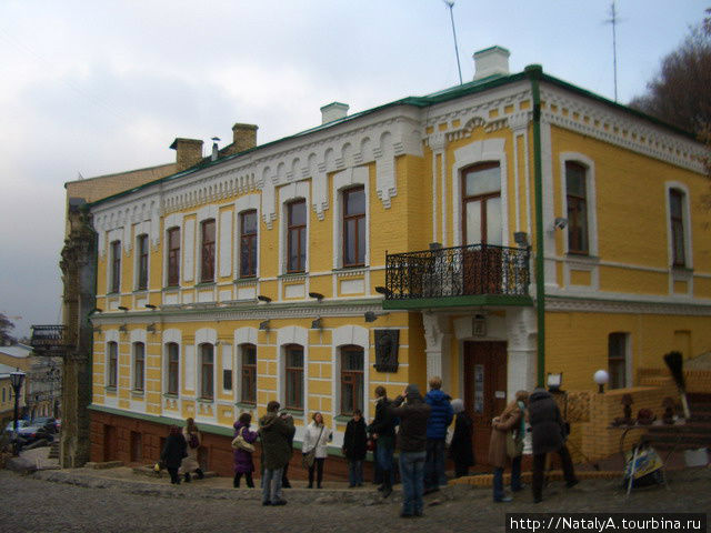 И наконец-то! Вот он. Дом номер тринадцать. Дом, в котором жил Михаил Булгаков. А вернее, вся его семья. В романе «Белая гвардия» дан его точный портрет: «Над двухэтажным домом № 13, постройки изумительной (на улицу квартира Турбиных была во втором этаже, а в маленький, покатый, уютный дворик – в первом), в саду, что лепился под крутейшей горой, все ветки на деревьях стали лапчаты и обвисли. Гору замело, засыпало сарайчики во дворе – и стала гигантская сахарная голова. Дом накрыло шапкой белого генерала, и в нижнем этаже (на улицу – первый, во двор под верандой Турбиных – подвальный) засветился слабенькими желтенькими огнями… а в верхнем – сильно и весело загорелись турбинские окна».