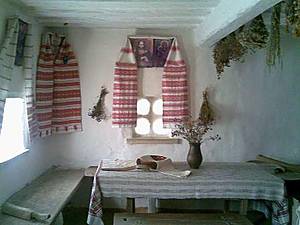 Рассматривая дом, можно было увидеть оконные и дверные проёмы, окрашенные в интенсивно красный цвет, символизирующий очищение огнём «всего входящего». Функцию оберега выполняли также приведены мелом крестики вокруг окон и двери. Оберегами служили и полотенца, которыми украшали окна и двери. Их вышивка обязательно отличалась от той, которой вышивали полотенца для картин и икон. Непременными домашними амулетами были чеснок и подкова. Последнюю прибивали к порогу или около него. Чеснок и различные травы развешивали вокруг дверей и окон.